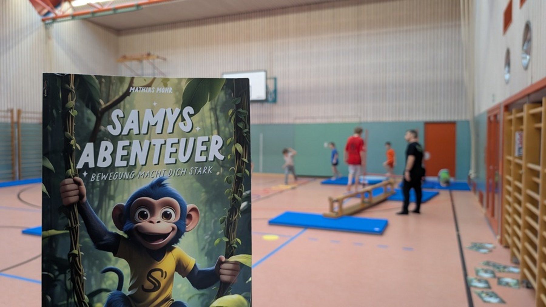 Und noch eine weitere Besonderheit bietet dieses Projekt: Im Vorfeld lesen die Kinder eine eigens dafür angefertigte Broschüre, in der Affe Samy jene Abenteuer erlebt, die dann in der Halle ausgeführt werden.